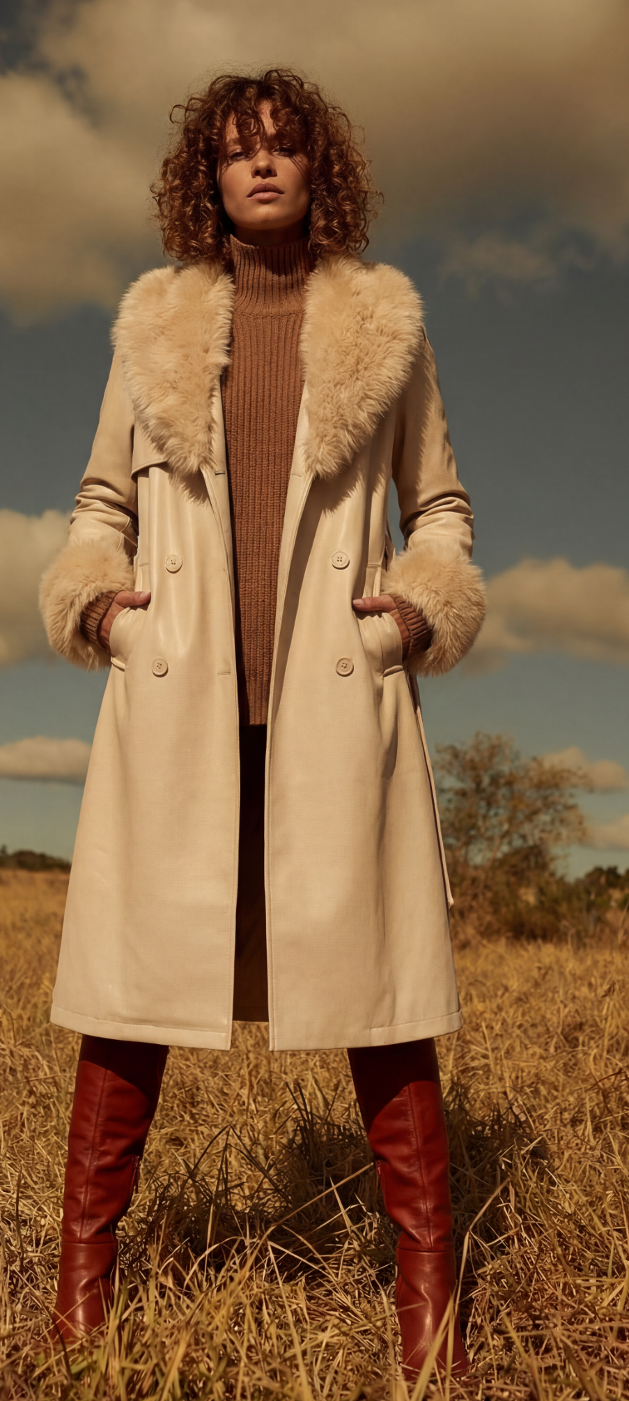 Plush faux fur trim frames the wide lapel collar and cuffs, adding warmth, softness, and an indulgent finish. The double-breasted detailing enhances its tailored appeal, while the clean midi length ensures versatility for both day and evening wear.