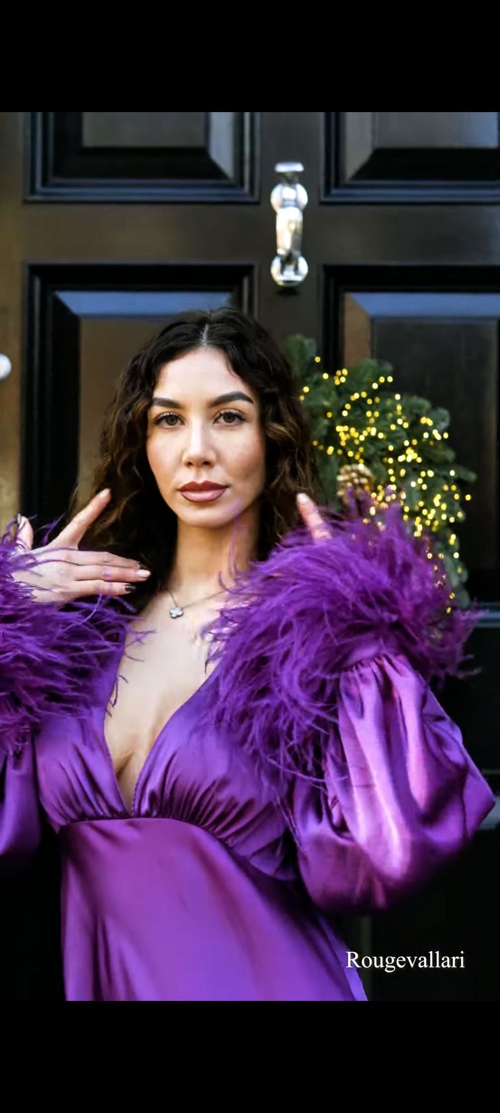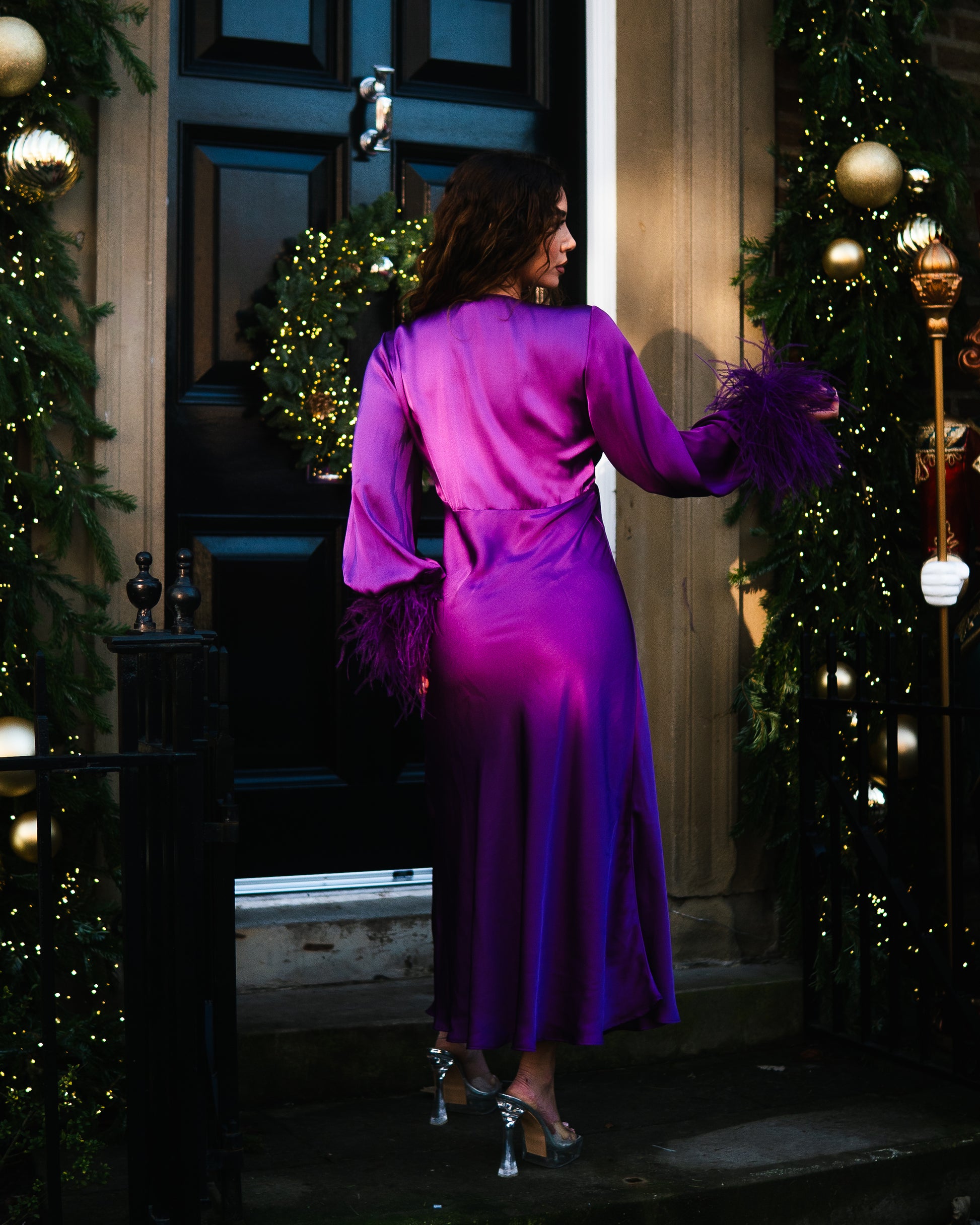 This is a luxurious purple silky satin midi dress designed for high-impact elegance and festive glamour.